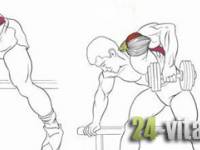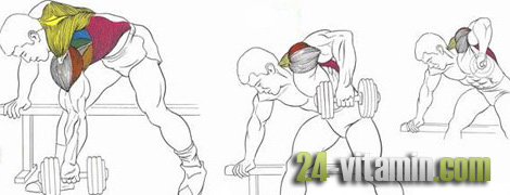 Упражнение для мышц спины. . Тяга гантели к поясу в наклоне, с опорой на горизо...