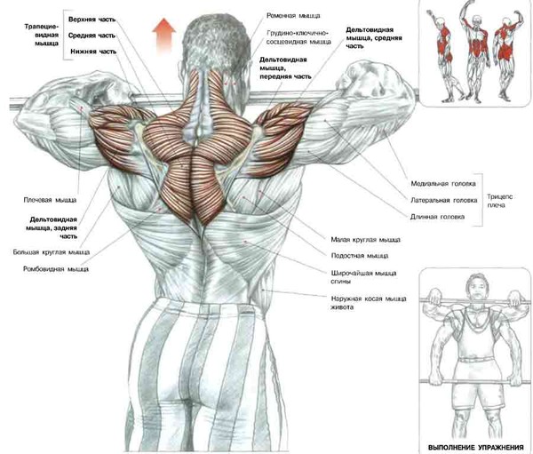 Ноги врозь. Спина прямая. Гриф штанги держать внизу у бедер, взяв ее