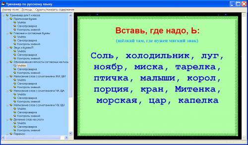 Интерактивный тренажер по русскому языку для первого класса к учебнику Л.М.Зелениной и Т.Е.Хохловой обеспечивает возможность тренировки ученика в выполнении всех типов заданий для первого класса. В тренажере используется около двенадцати тысяч слов в качестве объектов приложения изучаемых правил. Каждая тема в тренажёре проиллюстрирована разъясняющими её плакатами с правилами и примерами.