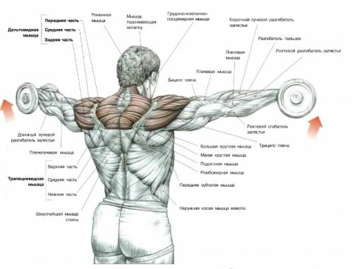 Спина прямая, руки вдоль тела. Руки с гантелями слегка согнуты в
